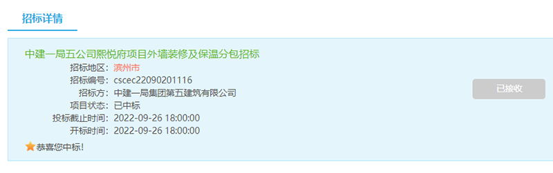 紧盯目标不放松,奋勇提速再冲刺。我公司凭借过硬的资质、良好的信誉、雄厚的技术实力,加之优秀的投标方案与合理报价,中标中建一局集团第五建筑有限公司招标项目!