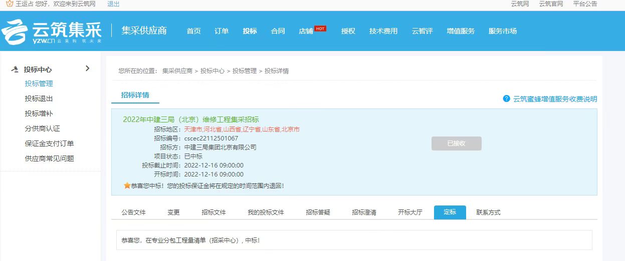 近日,2022年中建三局(北京)维修工程集采招标的招标工作圆满结束,经评标委员会评定和招标工作小组定标后认定,精品国产人妻一区二区三区久久集团正式成为为中标单位。中标标的:专业分包工程量清单(招采中心) 。