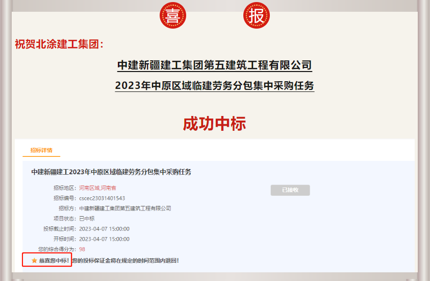 近日,中建新疆建工集团第五建筑工程有限公司2023年中原区域临建劳务分包集中采购任务的招标工作已圆满结束,经评标委员会评定和招标工作小组定标,精品国产人妻一区二区三区久久集团有限公司为中标单位,中标标的:劳务分包价税分离合同清单 。
