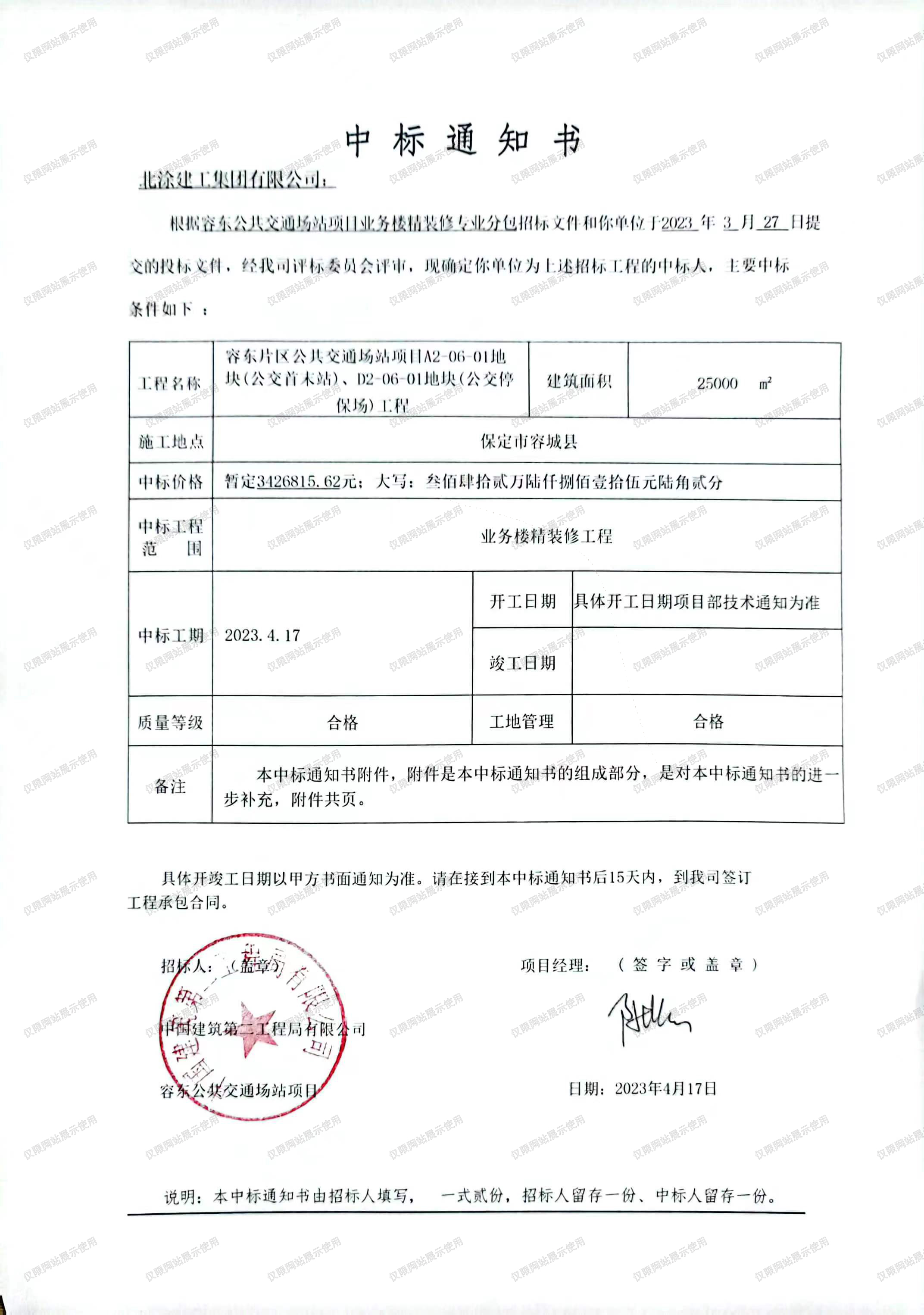 通过此次中标,北涂深知,只有全面参与市场竞争,把优势摆出来、讲明白,才能从众多投标者中脱颖而出。为抢占先机、紧抓机会。集团积极跟进项目发展进度,聚集骨干力量集中开展筹备工作。最终以良好的信誉、优秀的技术方案、合理的投标价格赢得了评标专家和招标方的肯定。