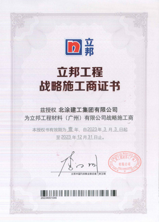2023年3月,精品国产人妻一区二区三区久久集团有限公司凭借与立邦工程的精诚合作及优质的服务,被授予立邦工程材料(广州)有限公司战略施工商称号。